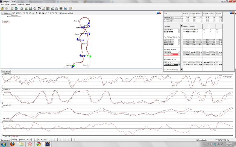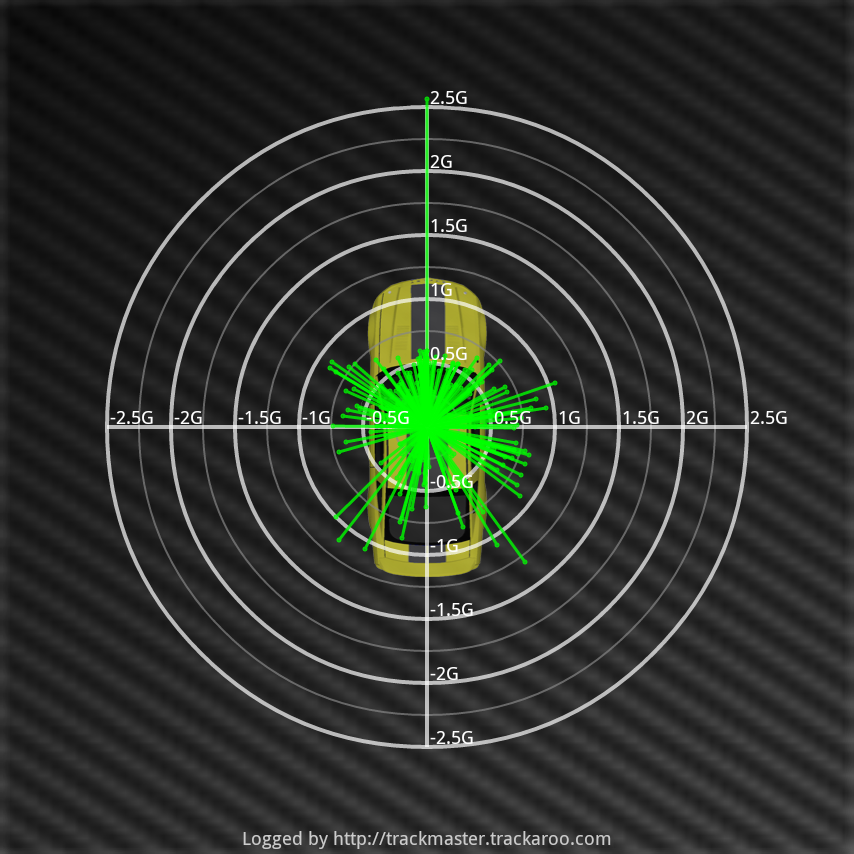 The data above isn’t that useful without the App or Google Earth files, but you can crank out Sector Times (based on split markers you place in the app or Google Earth) and lateral/longitudinal accelerations coupled with speed for any data point collected. It’s helpful, but not nearly as useful as a DL-1 by Race Technologies…