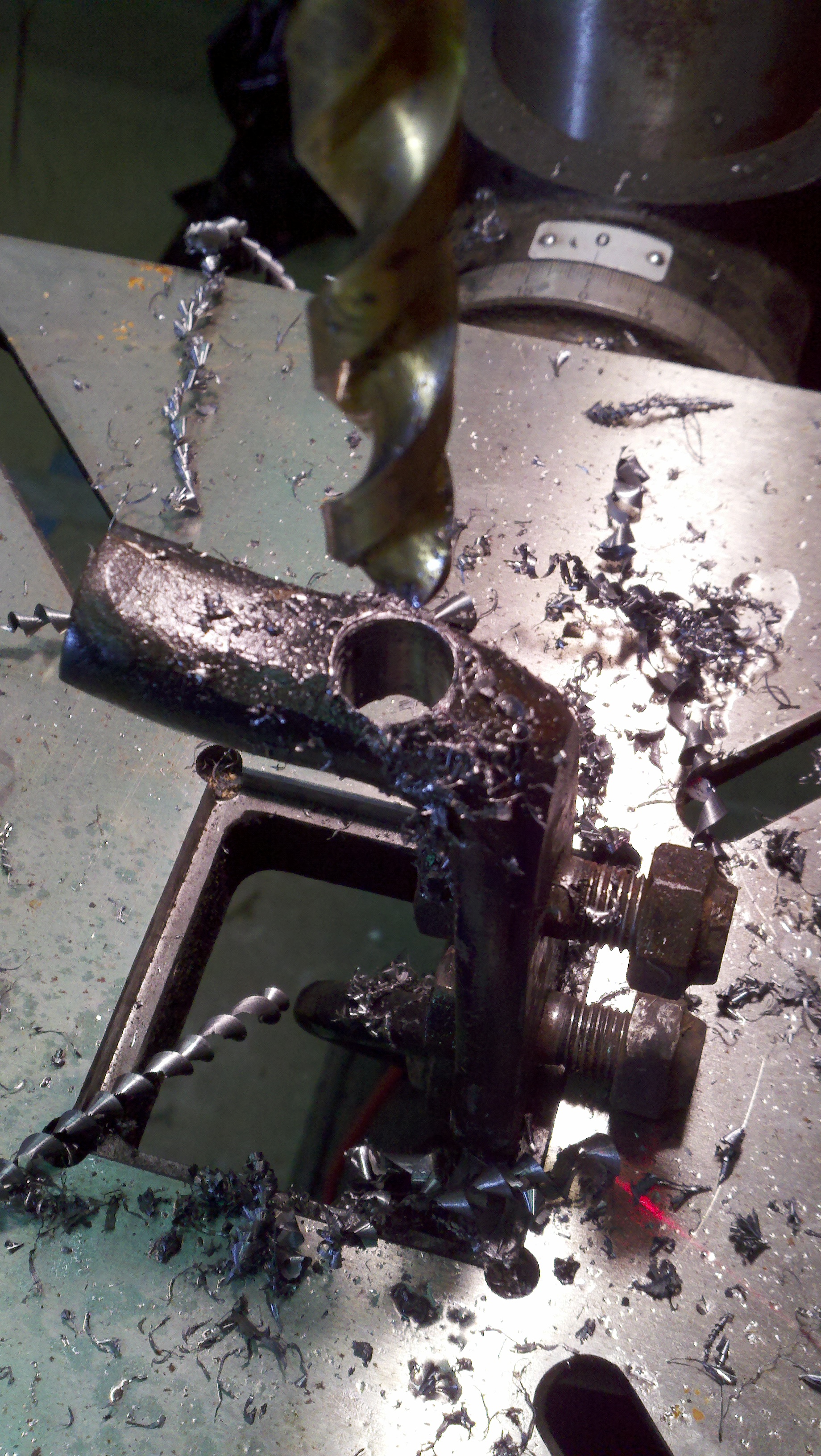 Using slow speed and lots of machine oil I drilled down through the arm. I used a 1/2″ drill bit to make the hole for the 1/2″ bolt I planned on using. Ideally I would have threaded the hole, but not having a tap on hand and worried about having enough space for a jam nut I elected to go with bolt and nuts.
