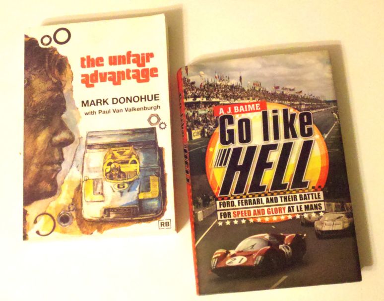 On the left is The Unfair Advantage, a great book on Mark Donohue’s racing career. It’s got tons of great stories about racing in the 60s including Trans Am, Indy, Le Mans, and SCCA club racing to name a few. You might actually pick up a few car setup tips here as well!