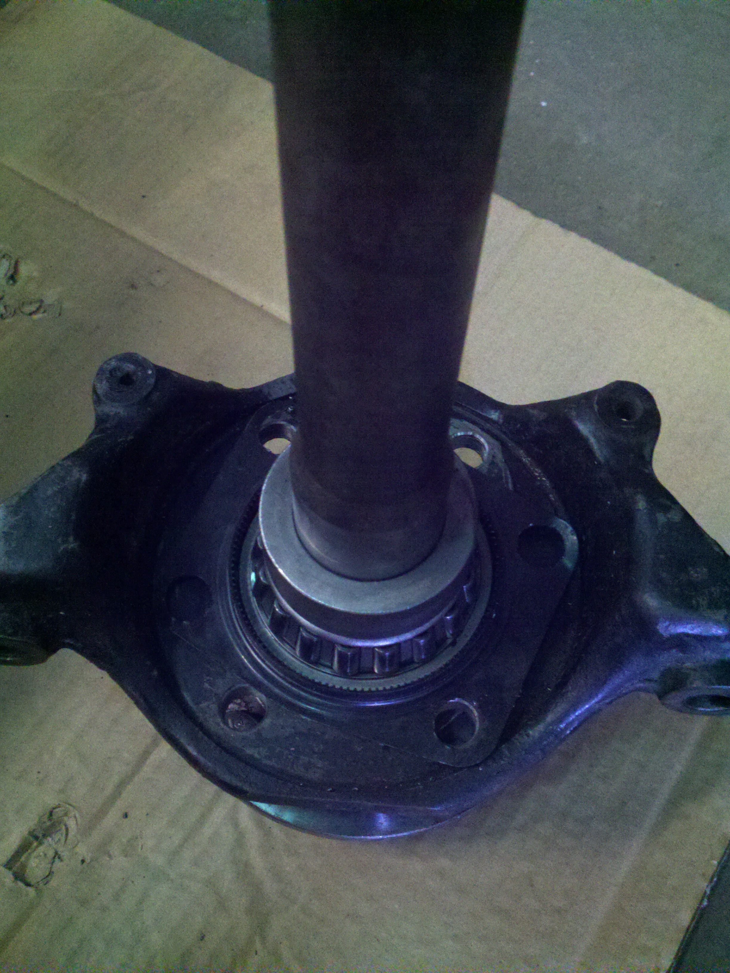 So at this point I’ve got $700 sunk into a housing (btw, you can buy brand new housing WITH axles and bearings for about $950 from Moser or Currie), need another bearing race (unknown $, but a set of bearings is $75) and I need a differential plus a complete overhaul kit for gear setup and carrier bearings. Aren’t cars fun? First step is to figure out if the brake caliper mounts are salvageable which means I’ve got to press off the bearings and stick the brackets on a drill press to see if I can’t get the holes to line up…