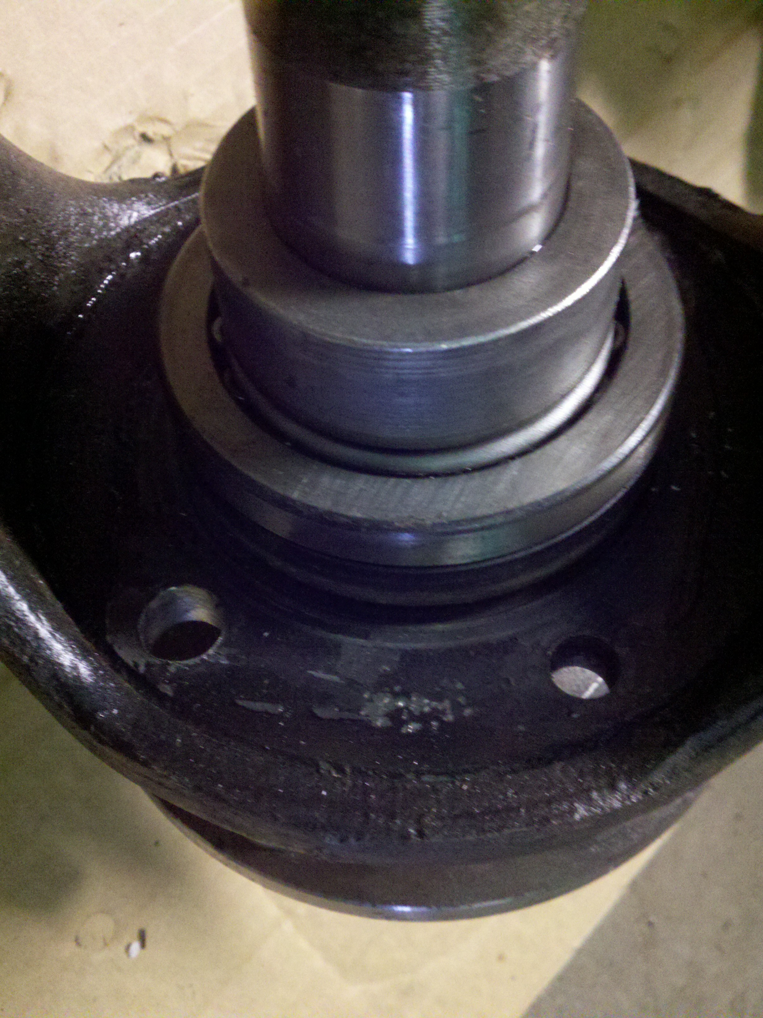 I get a call Thursday – “the diff is trashed”. Several questions later and I’m told that the previous shop (that had repacked the posi and swapped out 4.10s for my 3.73s) had knurled the bearing surfaces on the carrier since the bearings had spun in order to get them to stay on. Can’t say I’m totally surprised since the 3rd member was used when I bought it, but not the news I wanted to hear either. You can see the chisel marks in the picture above where they tried to enlarge the end so the bearing would stay…