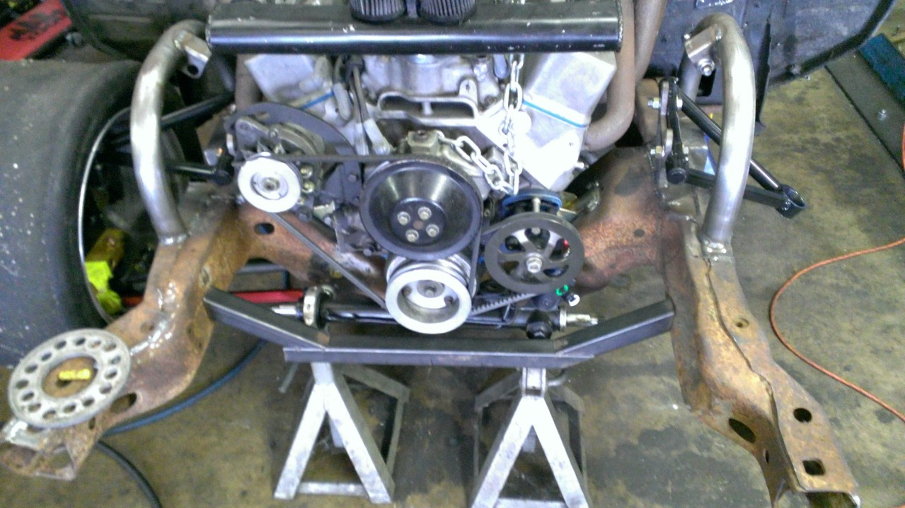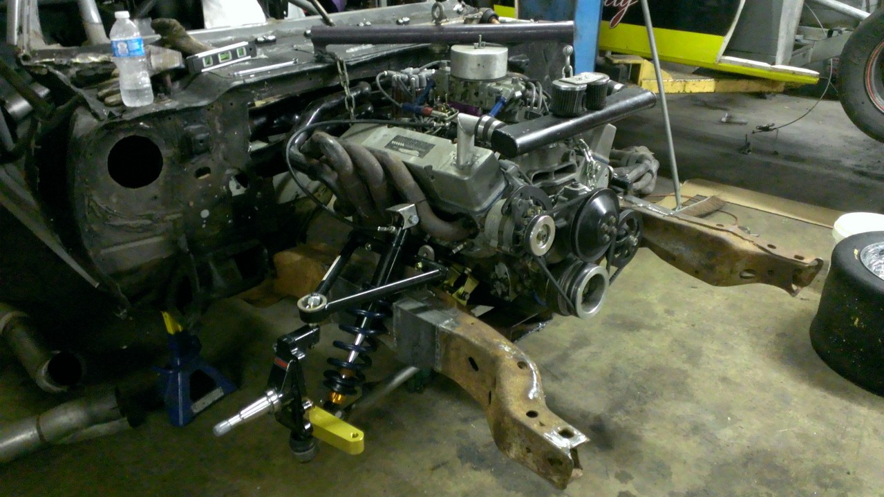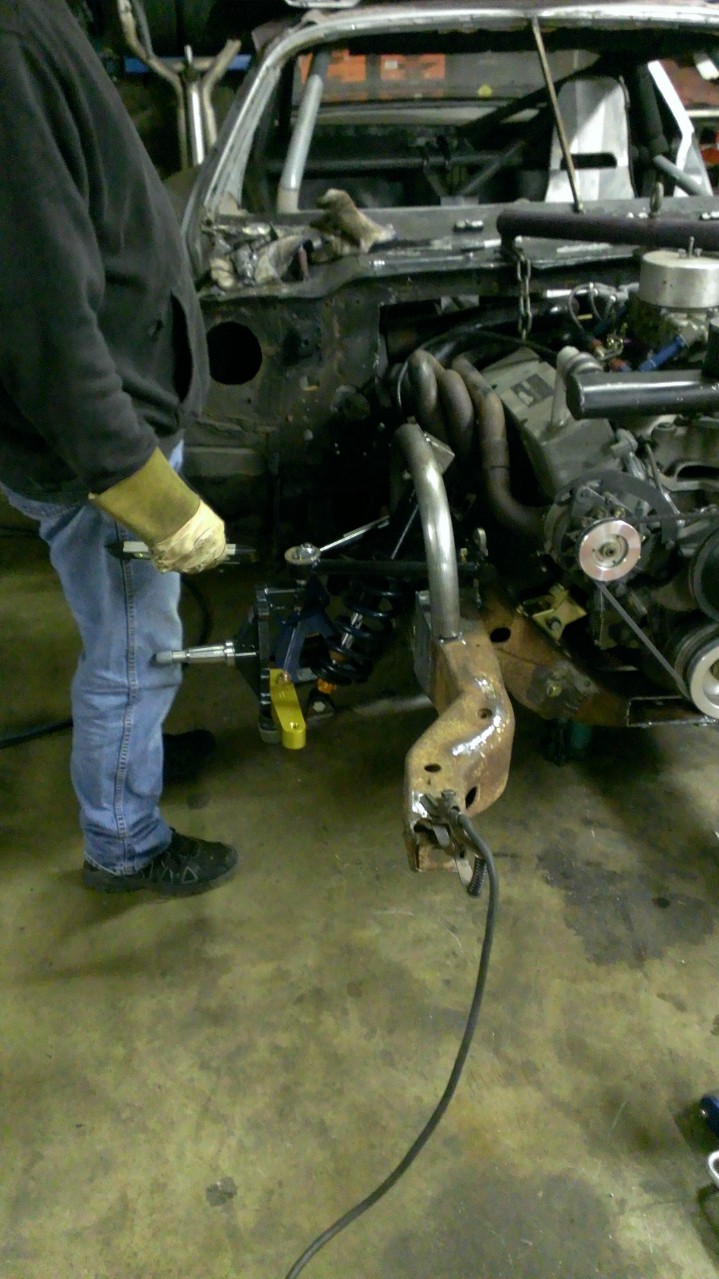 Two weeks ago I brought the subframe up to Todd for final weldout and installation into the car. Todd set to work and got us to the point of putting the engine back in for trying to resolve our header fitment issue. First up was cutting an ear off the control arm bracket.