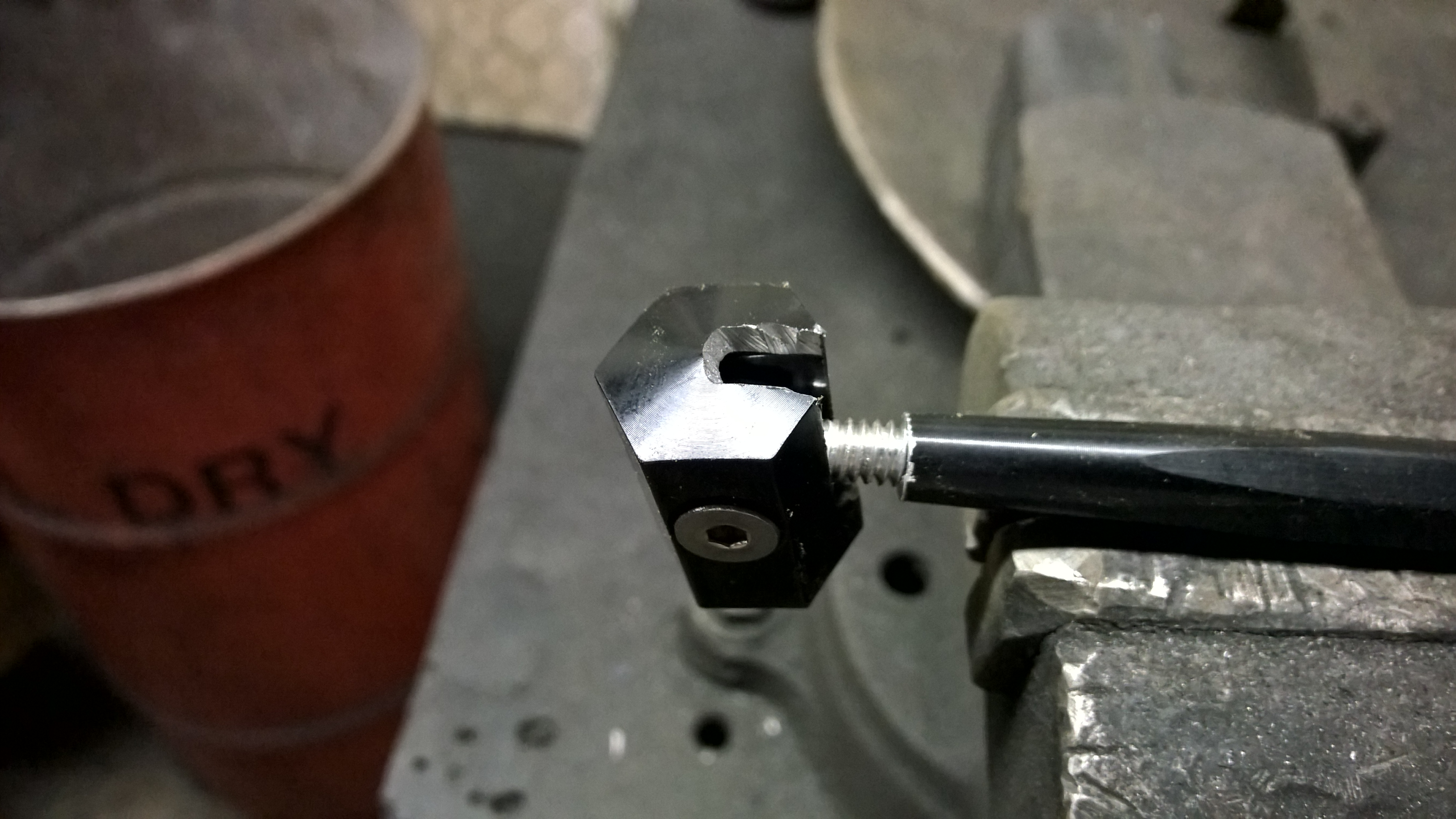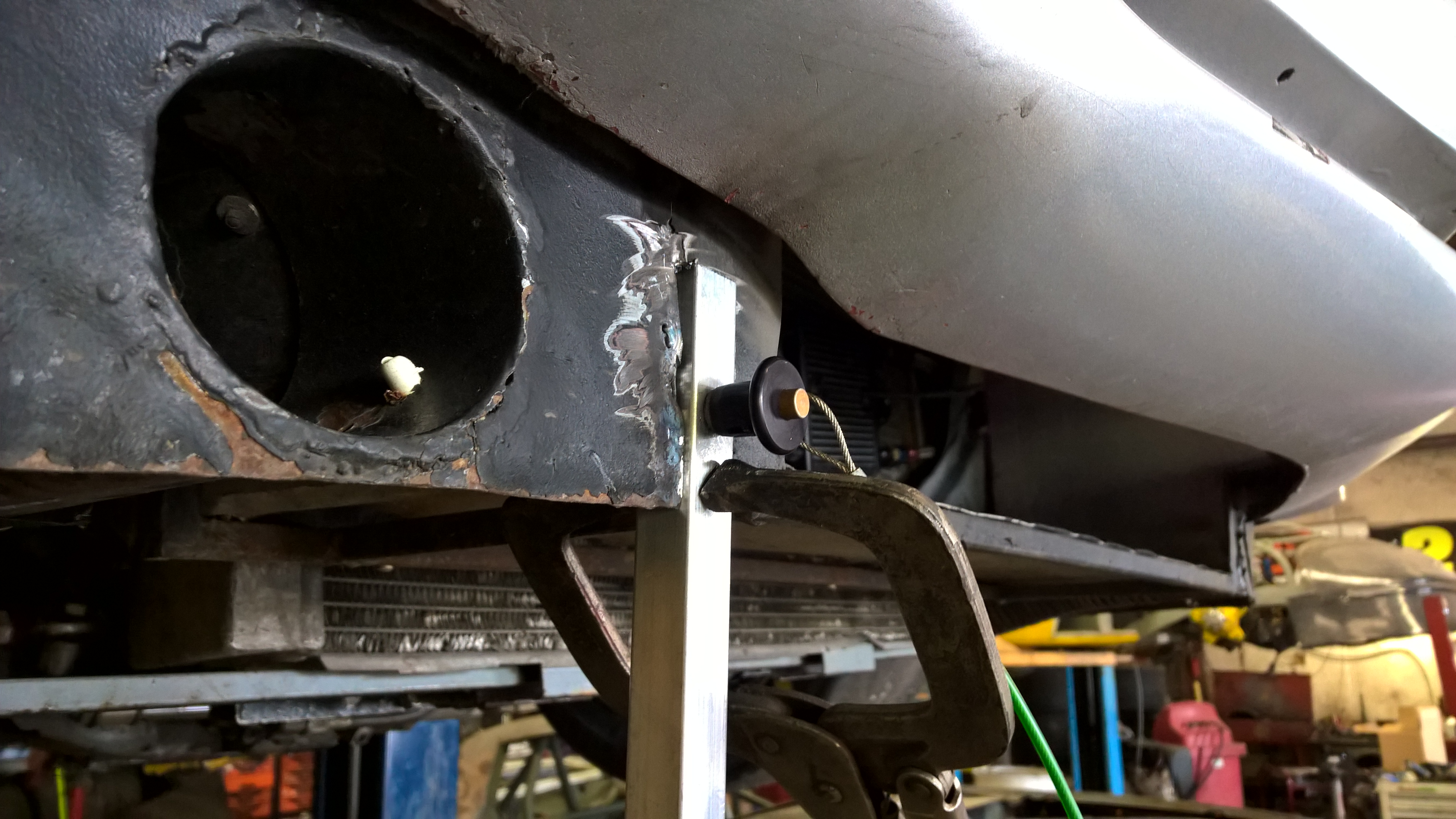 Everyone always tells you that the splitter has got to withstand LOTS OF DOWNFORCE. I knew this was largely nonsense for autocross speeds, there was no way at 70mph that I was going to need to support 200+ lbs hanging off the nose. Despite this, I did feel that some support was required in the center section. Not heeding Neil’s advise to use chain or cable to allow upward movement, I chose to use one of Long Acre’s spoiler support shafts which I modified to get a little more travel.