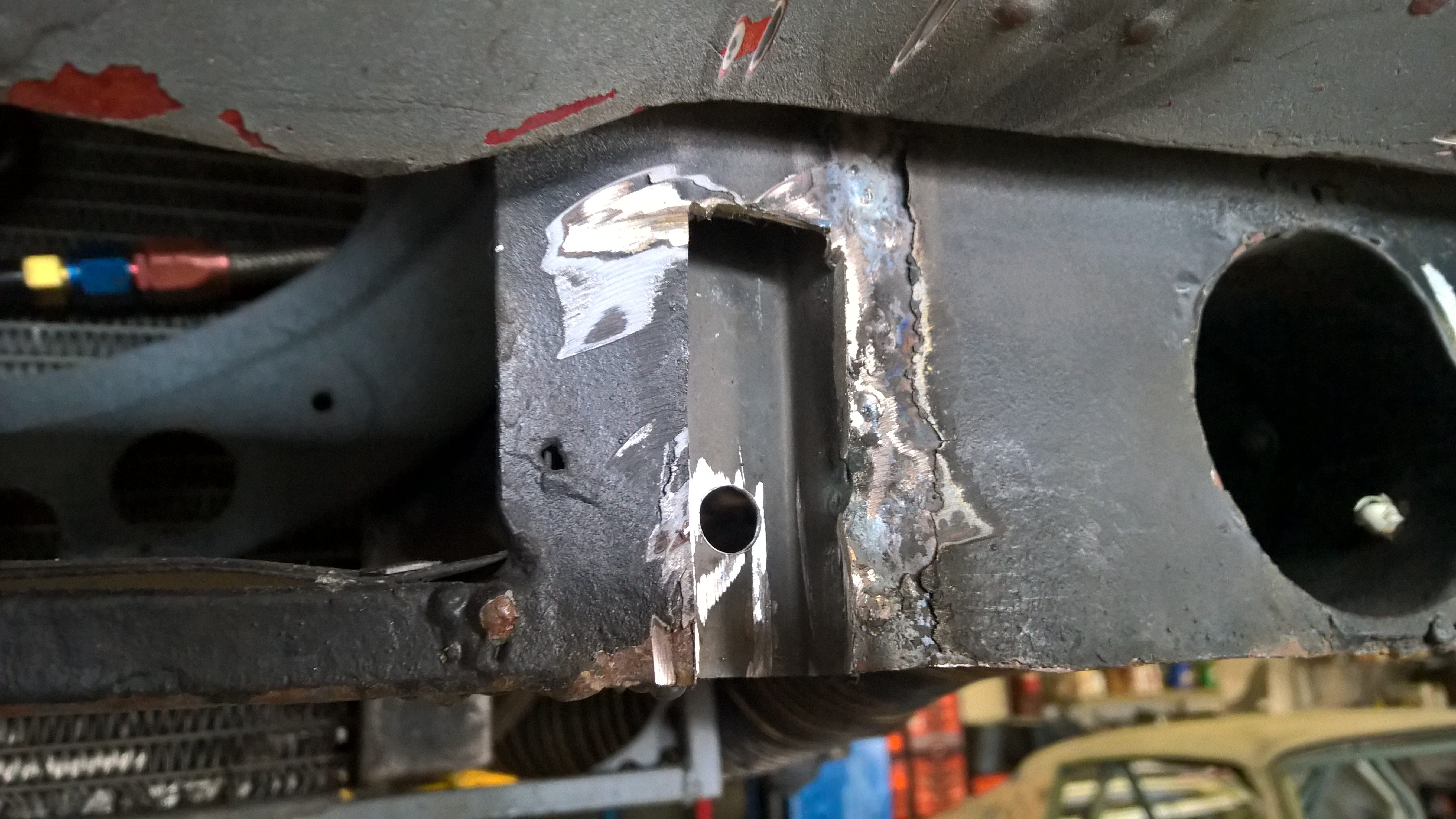 To mount the splitter to the body, I reused part of our existing air dam – basically a thin steel piece which is welded to the nose support structure. Into this, I inset 6 pieces of channel which I welded to the backside. These pieces would serve to capture the splitter supports.